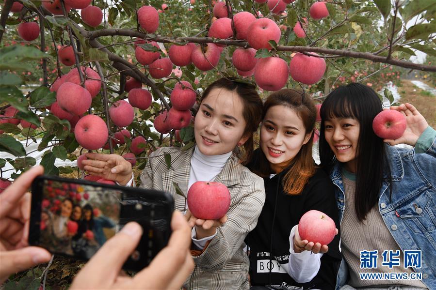 游客在陕西省延安市志丹县双河镇李家湾村果园拍照留影(2019年10月22日摄)。 新华社记者 陶明 摄