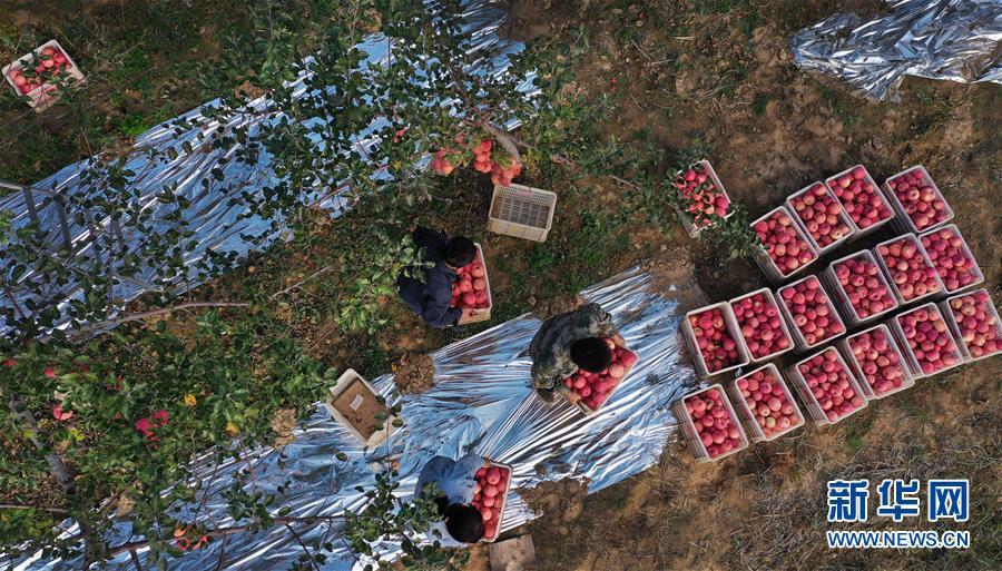 陕西省延安市志丹县双河镇李家湾村村民在果园采摘苹果(2019年10月22日摄,无人机照片)。 新华社记者 陶明 摄