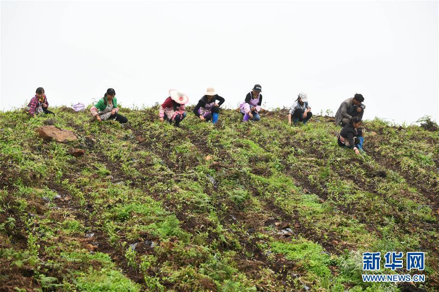 农民在贵州省普安县地瓜镇屯上村的“扶贫茶园”里给茶苗除草(2019年7月7日摄)。当地的茶园栽种有浙江安吉黄杜村捐赠的白茶苗。 新华社记者 杨文斌 摄