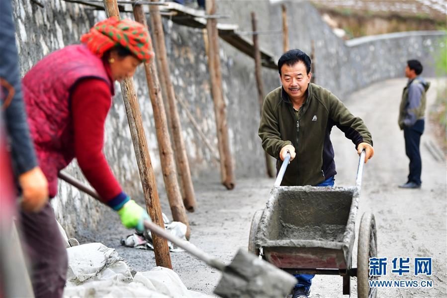 甘肃省甘南藏族自治州舟曲县果耶镇勒阿村驻村第一书记张金利(右)和村民一起修建入村道路的护坡(2020年4月22日摄)。 新华社记者 陈斌 摄