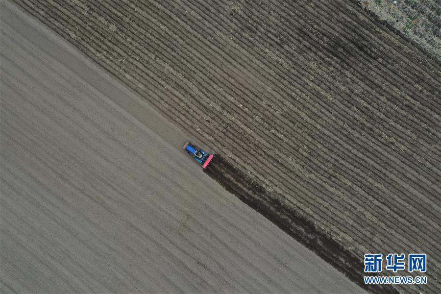 吉林省安图县龙山村农民在田间播种玉米(5月8日无人机拍摄)。