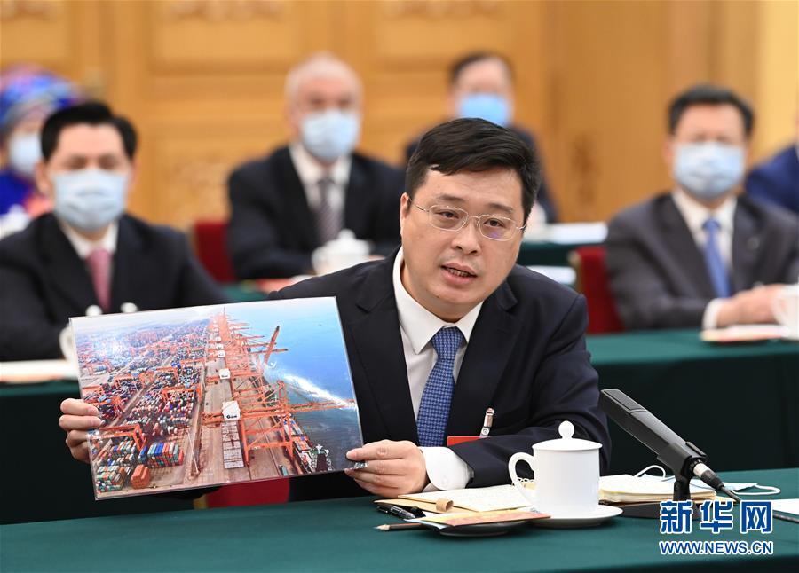 5月23日,全国人大代表韦韬在参加广西代表团审议时展示钦州港的照片。新华社记者 申宏 摄