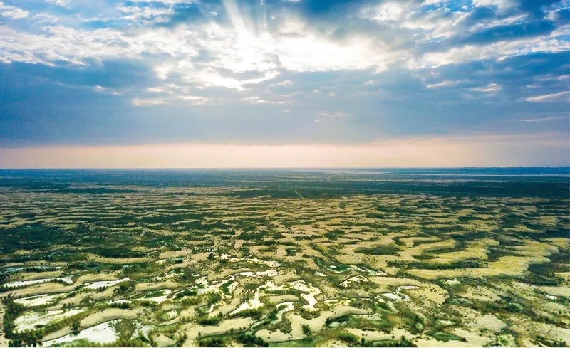 内蒙古杭锦旗在黄河凌汛期向沙漠引水,让水患变水利,沙地变湿地,库布其沙漠北缘显现出“水沙共存”美景(2018年8月1日无人机拍摄)。2014年,库布其沙漠被联合国环境署确定为“全球沙漠生态经济示范区”。新华社记者 邢广利/摄