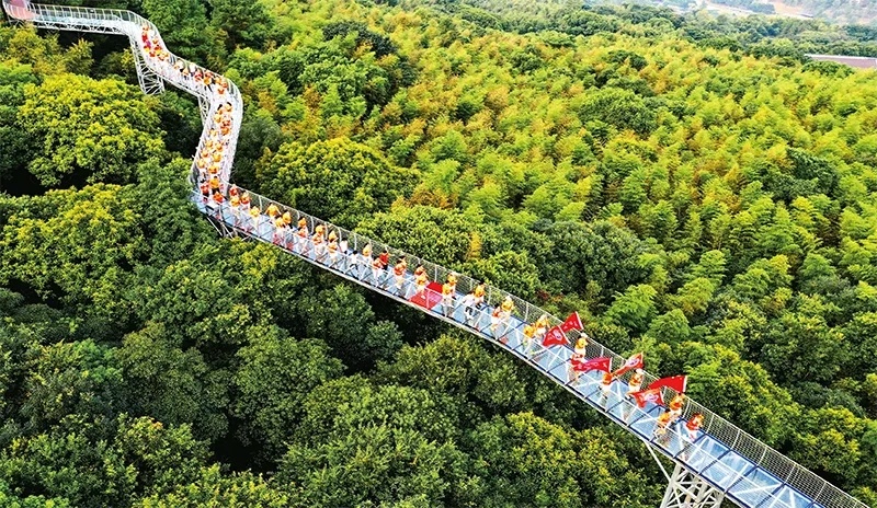 近年来,江西省赣州市大余县深入践行“绿水青山就是金山银山”的理念,将丫山打造成集运动、休闲、健康、养老、教育、文化、旅游为一体的国家级运动休闲特色小镇,吸引了众多国内外运动爱好者前来体验。图为2019年9月8日,赣州市大余县丫山景区,跑步爱好者在晨跑。人民图片 叶功富/摄