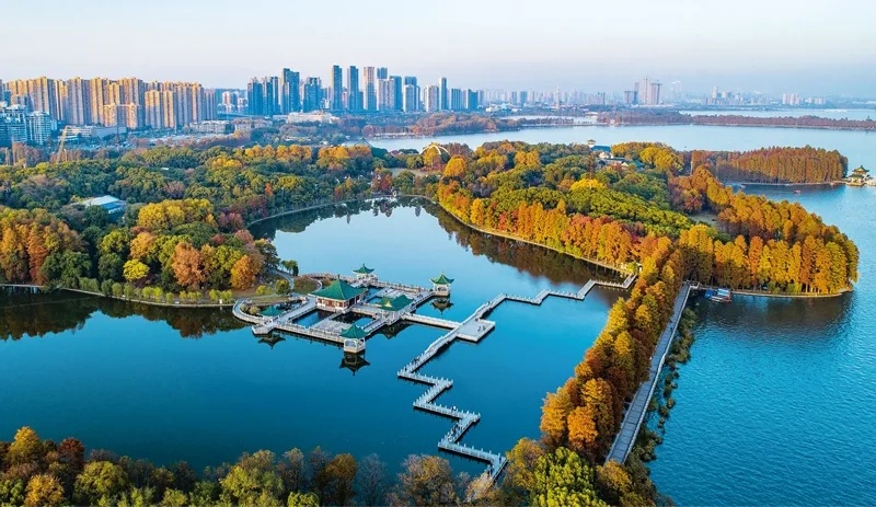 目前,湖北省正以系统性举措推进山水林田湖草一体化修复,实施长江防护林建设、水土流失治理、河湖湿地保护等一批生态重点工程,优化长江生态环境。图为无人机拍摄的湖北省武汉市东湖绿道。新华社记者 肖艺九/摄