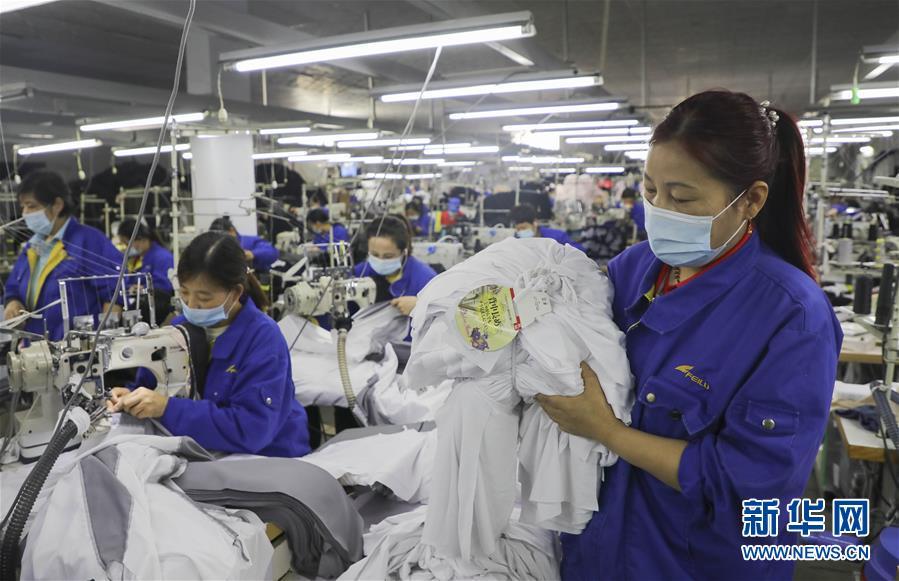 5月7日,工人们在山东省临沂市兰山区银雀山街道前岗头社区扶贫车间赶制出口订单。这是自复工复产以来,该扶贫车间的第五批外贸订单。新华社记者 范长国 摄