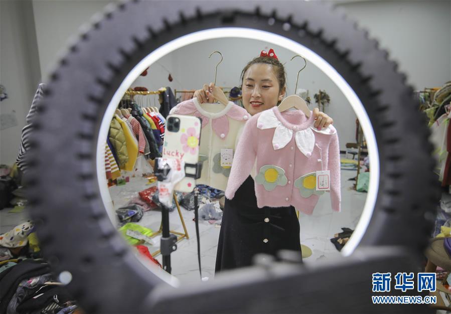 5月8日,在山东省临沂市兰山区的山东临谷电商科技创新孵化园内,一名网络主播通过直播销售童装。 新华社记者 范长国 摄
