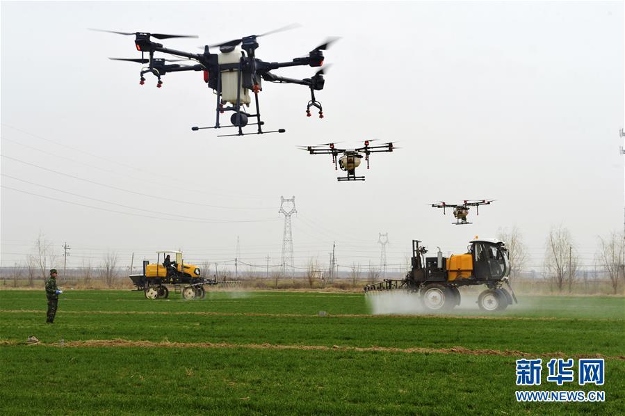 在河北省泊头市四营乡黄屯村的麦田内,合作社工作人员利用植保无人机和喷雾机作业(3月12日摄)。新华社记者 牟宇 摄