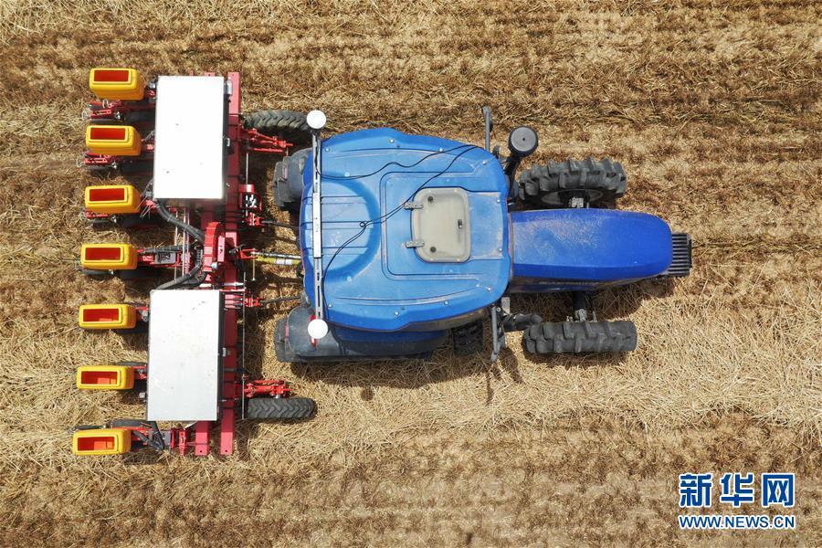 在河南省邓州市小杨营镇安众村,加装有北斗导航系统的拖拉机在无人驾驶状态下播种(5月26日摄,无人机照片)。新华社记者 冯大鹏 摄