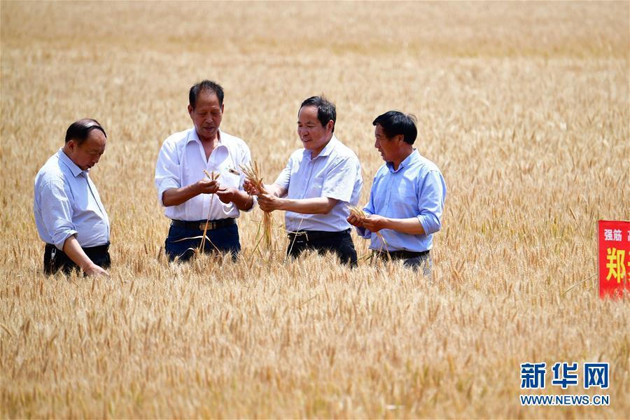 在河南省南阳市宛城区高庙镇谢营村附近的高标准农田,农技专家在查看小麦长势(5月20日摄)。新华社记者 冯大鹏 摄