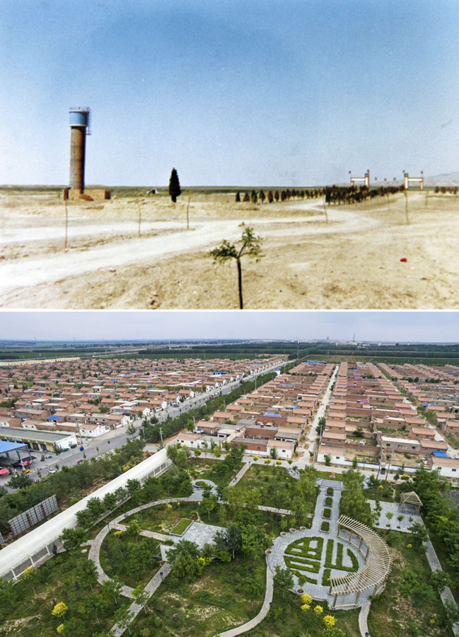 拼版照片:上图为宁夏永宁县闽宁镇建设初期的乡镇雏形(资料照片);下图为俯瞰宁夏永宁县闽宁镇原隆移民村(2016年7月22日摄,新华社记者 王鹏摄)