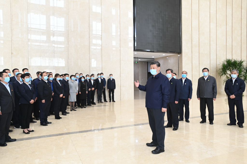 2020年5月12日上午,习近平在山西转型综合改革示范区政务服务中心考察时,同工作人员亲切交流。 新华社记者 李学仁 摄