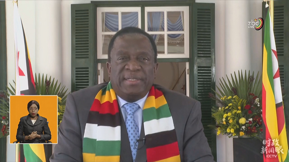 5月12日,津巴布韦总统姆南加古瓦在总统府接见中国抗疫医疗专家组,并在国家电视台发表讲话时,再次感谢中国帮助津巴布韦抗击新冠肺炎疫情。(总台央视记者马培敏提供)