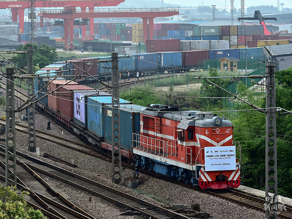 6月5日,满载防疫物资的中欧班列在浙江义乌西站启程,经由新疆阿拉山口口岸出境,前往西班牙首都马德里。