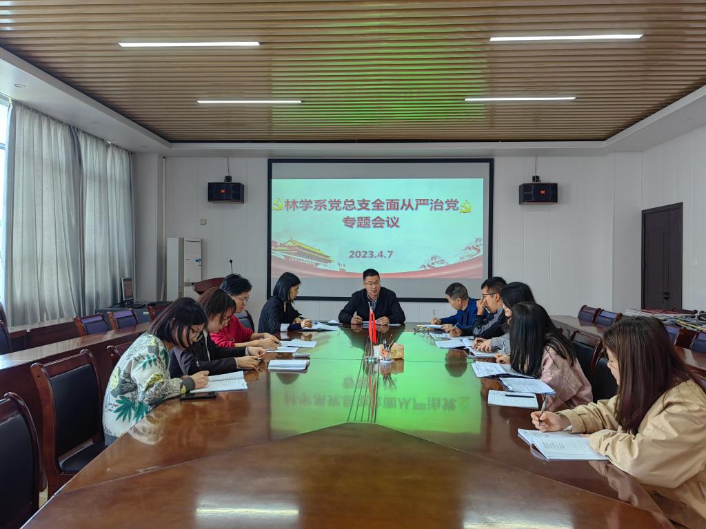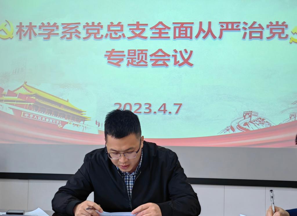 2023年4月7日上午,林学系党总支在林学楼四楼会议室召开全面从严治党专题会议。林学系党政班子成员、全体辅导员参加会议。会议由林学系党总支副书记(主持工作)傅成杰主持。