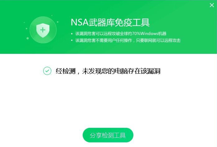 4、使用360“NSA武器库免疫工具”(见附件无《360“NSA武器库免疫工具”》)检测系统是否仍存在漏洞,出现如下图所示表示修复成功。