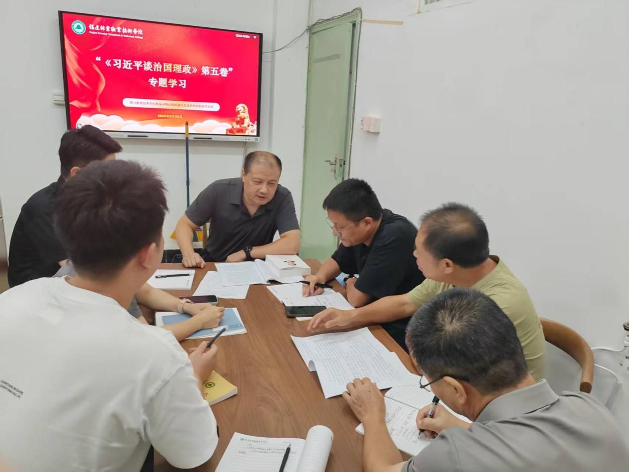 会上学习了习近平总书记近期重要讲话重要指示批示精神、《习近平谈治国理政》第五卷、“以教育家精神铸魂强师,谱写教育强国建设华章”内容,以及习近平总书记给福建农林大学全体师生的重要回信精神。围绕学习内容展开深入研讨,纷纷表示要立足本职岗位,将精神实质融入教育教学各环节,以高尚的道德情操、扎实的学识功底和无私的奉献精神,着力培养德智体美劳全面发展的社会主义建设者和接班人,为教育强国建设注入不竭动力。