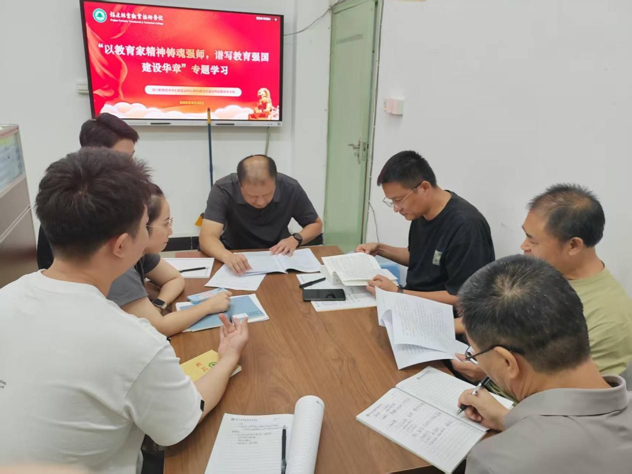 会上学习了习近平总书记近期重要讲话重要指示批示精神、《习近平谈治国理政》第五卷、“以教育家精神铸魂强师,谱写教育强国建设华章”内容,以及习近平总书记给福建农林大学全体师生的重要回信精神。围绕学习内容展开深入研讨,纷纷表示要立足本职岗位,将精神实质融入教育教学各环节,以高尚的道德情操、扎实的学识功底和无私的奉献精神,着力培养德智体美劳全面发展的社会主义建设者和接班人,为教育强国建设注入不竭动力。