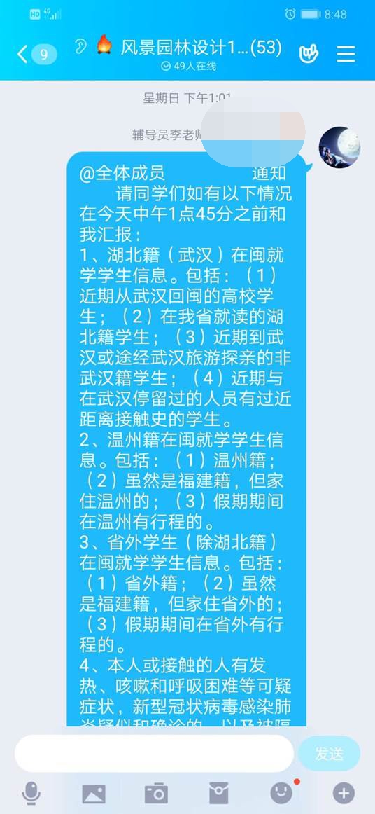 林学系学生科长、辅导员丁灵妍:活用网络阵地,通过微信、QQ与学生保持密切联系,谋划设计网上学生活动,通过微信、微博、直播平台和QQ群等及时传达正确的疫情防疫知识和学院相关精神,引导学生增强自我保护意识。同时关注困难学生,做好答疑解惑。