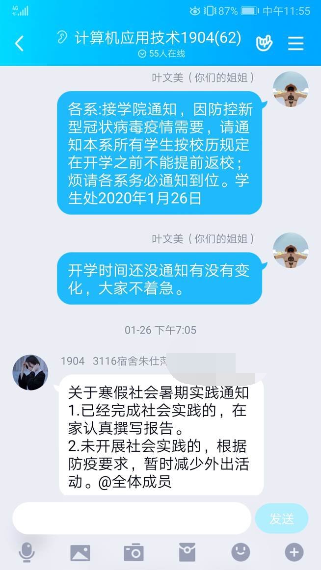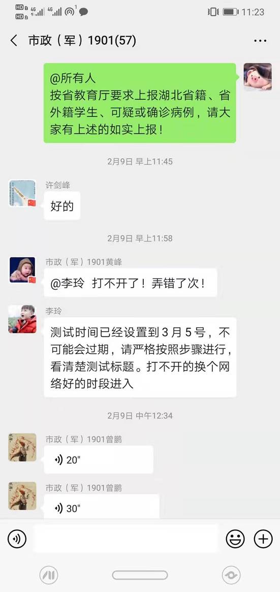交通系学生科长、辅导员陈静:一是通过微信群、学生QQ群、电话等形式,一对一将国家、学院发布的相关舆情通知要求宣传到位。二是加强摸排,及时了解和掌握湖北籍学生、途经湖北或与疫区人员接触学生、可疑症状学生等情况。