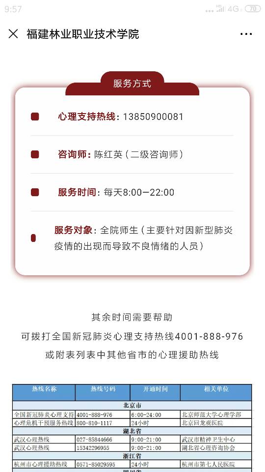 “老师,和您聊完之后,我觉得舒服多了,相信在全国人民的共同努力下我们一定能战胜疫情,赢得战‘疫’!”。这个说话语气轻松而有力的同学是我院疫情专项心理热线开通后接待的一名学生。为进一步做好疫情防控期间对师生的心理健康支持与服务工作,我院心理咨询中心率先于1月30日起每天8:00-22:00面向全院师生开展心理辅导服务,采用电话、微信、QQ等方式开展。此外,学生处陈红英老师成为南平团市委等机构开通的心理支持热线和网络心理辅导服务的志愿者,为南平市各级各类学校学生、教师提供疫情下的心理支持和危机干预。