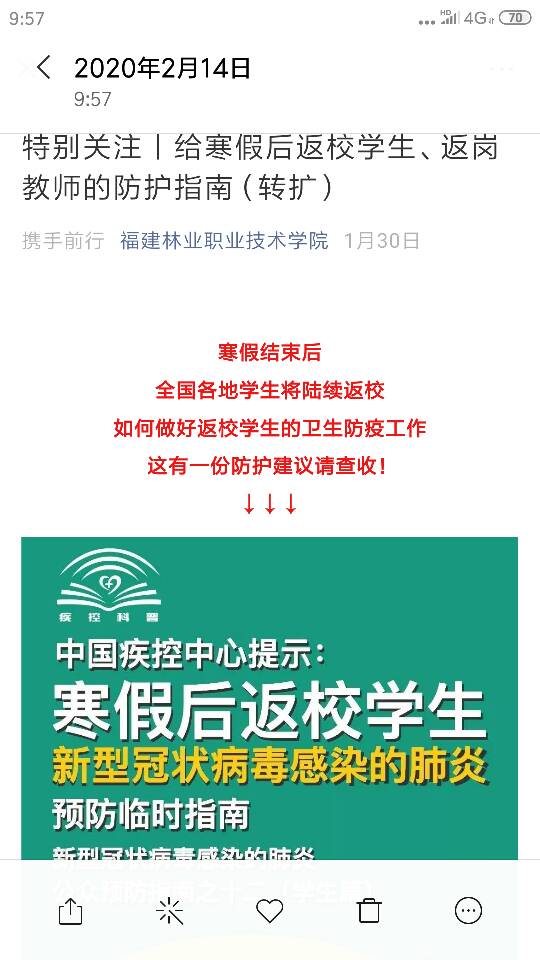 通过网站、微信公众号、微信群和QQ群等平台,转发学院《致全院学生的一封信》、《我是林职人,我承诺》、《防护指南》等,大力宣传新型冠状病毒的相关防护知识、防控要点、注意事项、救治措施。