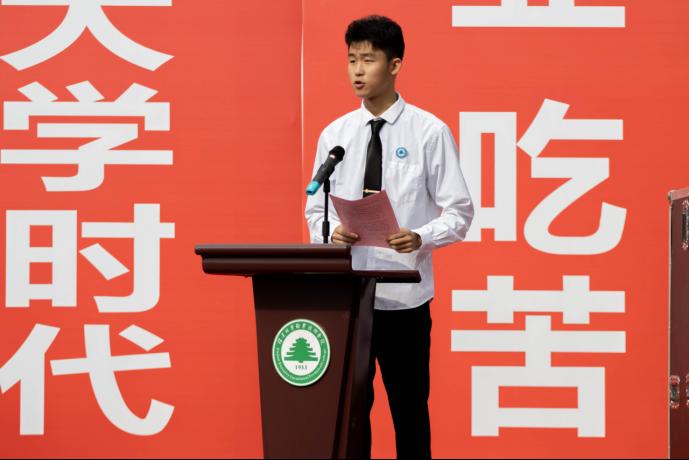 来自安徽省的园林系风景园林设计2103班的杨国诚,艺术传媒系新闻2101班的王锦琳作为新生代表分别发表了热情洋溢的发言。他们承诺在接下来的军训期间,听从教官指挥,服从教官安排,弘扬不怕苦、不怕累的精神,刻苦训练,认真做好每一个动作,每一个姿势,磨练自己顽强的意志,以良好的精神风貌展现出当代大学生的风采。
