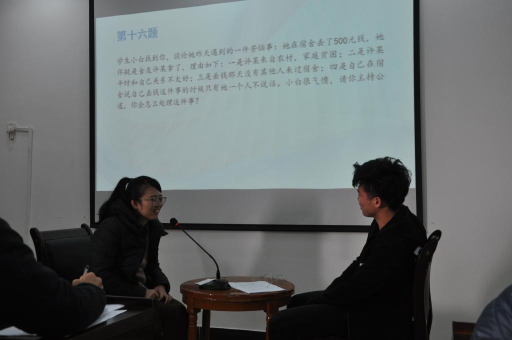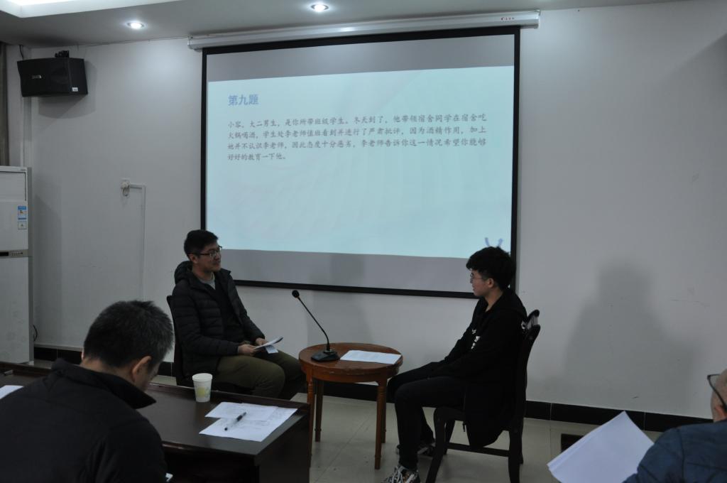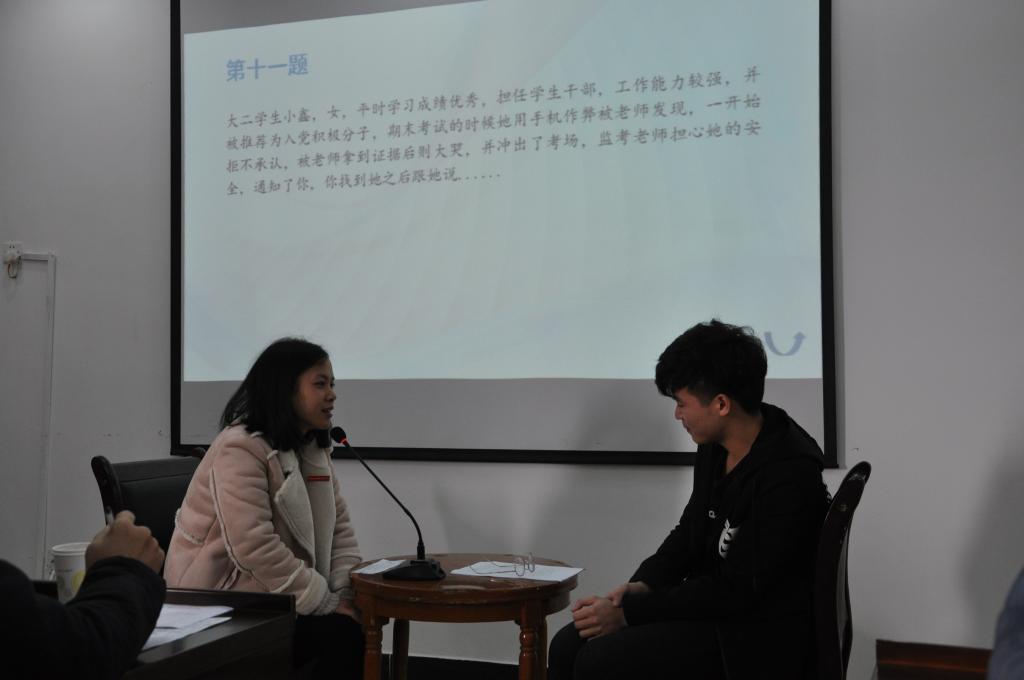 此次谈心谈话考题涉及面广,类型丰富,主要围绕学生日常学习生活中经常出现的各种困扰提出问题,全面考察了辅导员对相关政策、校纪校规、学生特点、学生成长成才规律的了解把握及对学生的教育引导能力,旨在考察辅导员运用专业知识、交流技巧等辅导员工作技能帮助学生解决学习、生活中遇到的各类问题。在比赛现场,辅导员与学生进行情景模拟谈话,针对学生遇到的转专业、失恋、宿舍人际关系紧张等问题展开了谈心,各位辅导员们沉着应对参演学生的各类刁难,表现冷静且到位。