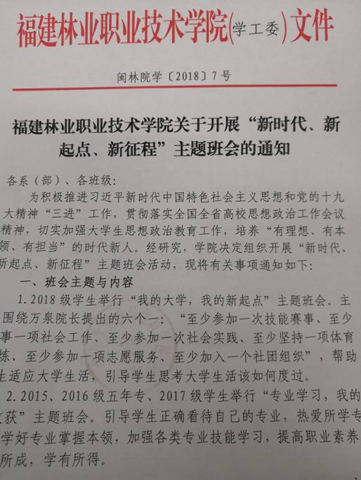 为推进习近平新时代中国特色社会主义思想和党的十九大精神“三进”工作,贯彻落实全国、全省高校思想政治工作会议精神,培养“有理想、有本领、有担当”时代新人,2018年9月19日—10月10日,在学工委统一部署下,学院各系部纷纷开展“新时代、新起点、新征程”主题班会。