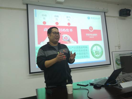 11月6日下午,江南校区第一会议室,2018年辅导员能力提升培训班迎来了第二讲,来自福建师范大学校团委组织部部长刘晓晖为全体专职辅导员开展“新时代高校共青团建设的经验分享”主题讲座。学生处负责人李霞主持。