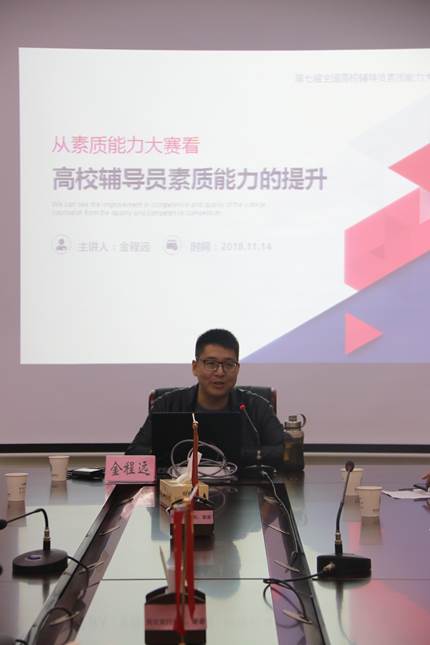 金程远结合自身辅导员工作经历从“高校辅导员应具备的素质能力”、“辅导员素质能力大赛的新变化与参赛感悟”、“作为一名欣赏型辅导员的成长之路与成长之法”等三个方面与大家分享了他作为一名奋斗在一线的思想政治工作者的经验。