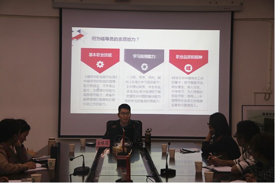11月14日上午9点,江南校区第一会议室,辅导员培训班特邀2018年全国辅导员素质能力大赛一等奖获得者——金程远为全体辅导员开设“从素质能力大赛看高校辅导员能力的提升”专题讲座,学生处陈红英负责主持。