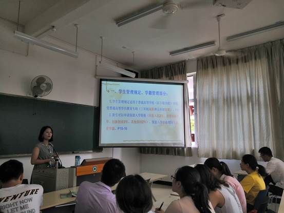 会上,教务处黄淑燕介绍了《学生手册》教学管理部分尤其是学生管理、学籍管理等相关制度的应知必知项目,对学生的学籍认定、学生考勤进行了重点阐述,并就管理中遇见的常见问题进行了剖析,为教学管理部分划出了重点。