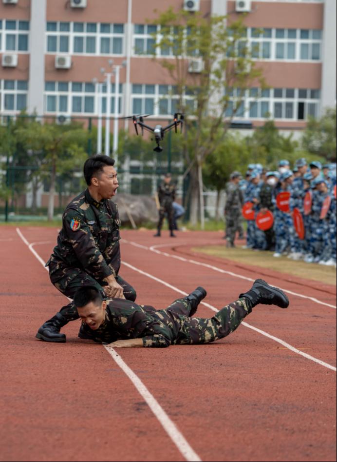军训团教官向全体人员做军训示范,整套动作标准规范、整齐流畅。
