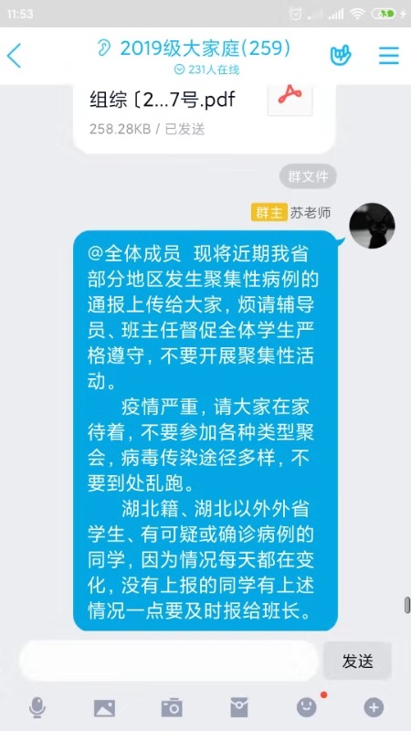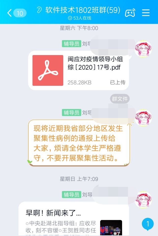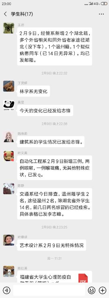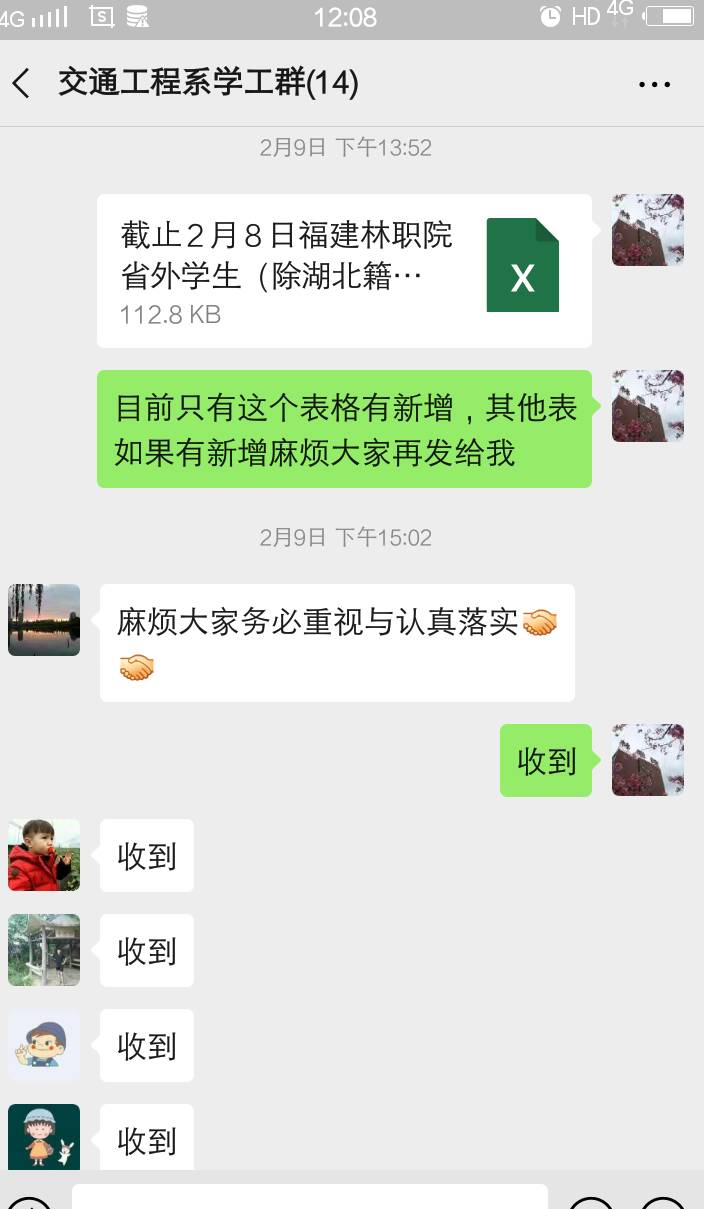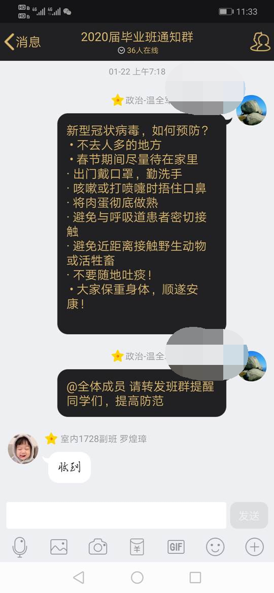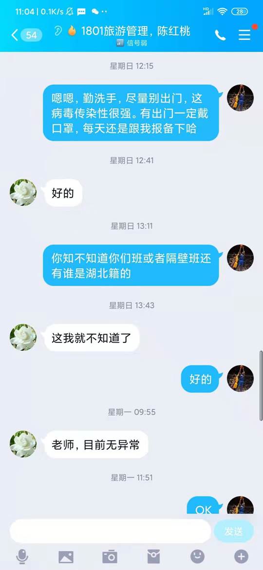 交通系学生科长、辅导员陈静:一是通过微信群、学生QQ群、电话等形式,一对一将国家、学院发布的相关舆情通知要求宣传到位。二是加强摸排,及时了解和掌握湖北籍学生、途经湖北或与疫区人员接触学生、可疑症状学生等情况。