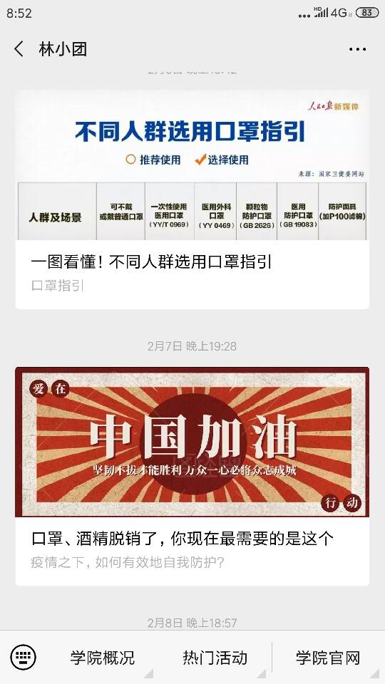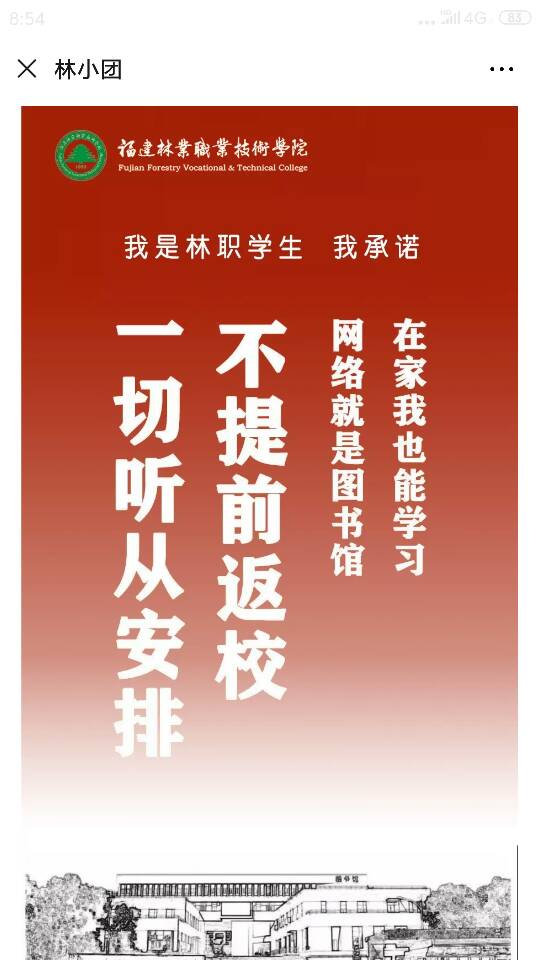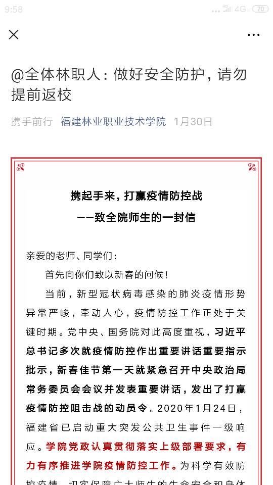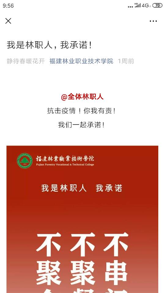 通过网站、微信公众号、微信群和QQ群等平台,转发学院《致全院学生的一封信》、《我是林职人,我承诺》、《防护指南》等,大力宣传新型冠状病毒的相关防护知识、防控要点、注意事项、救治措施。