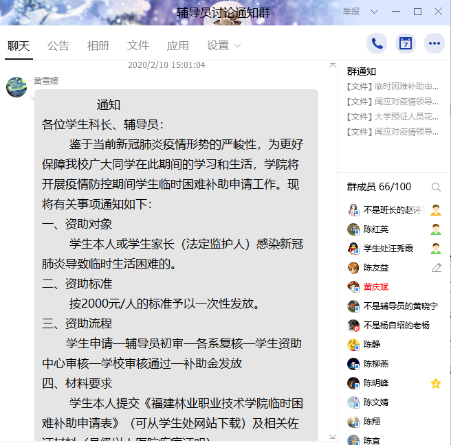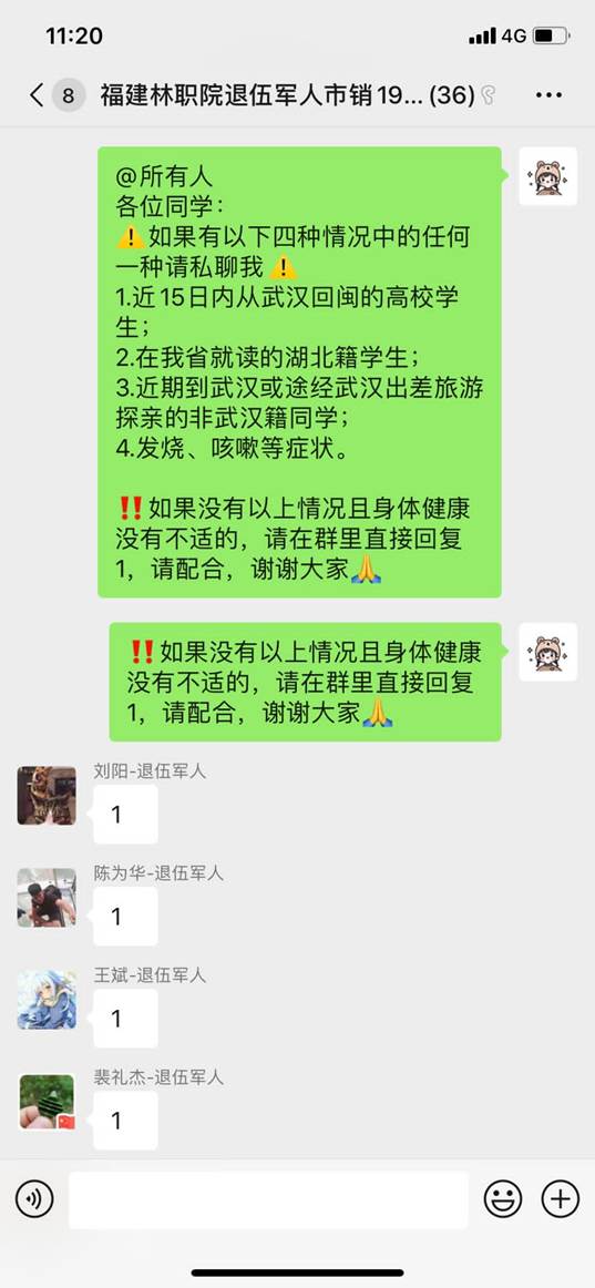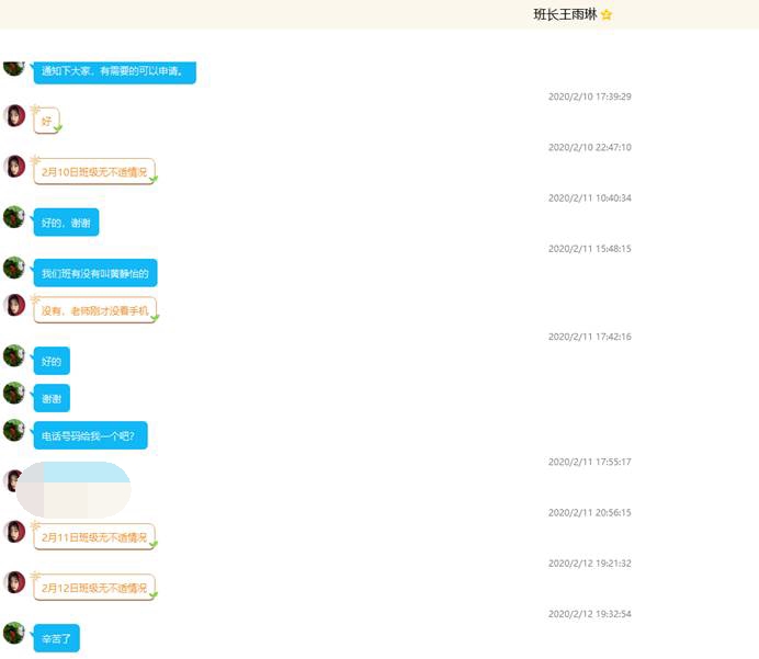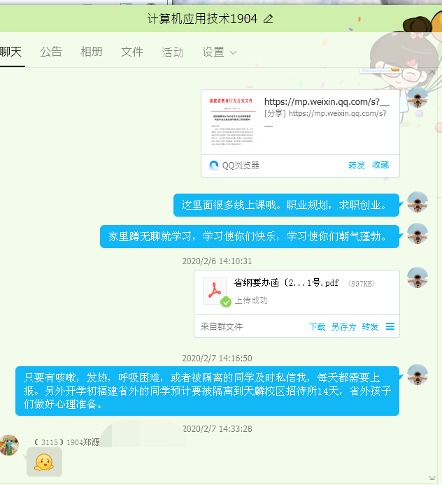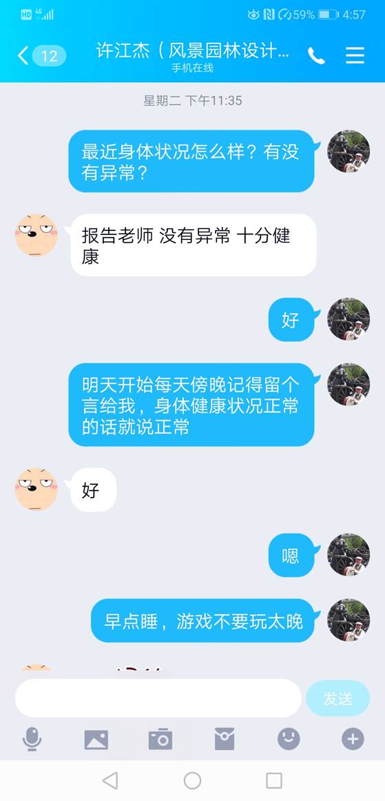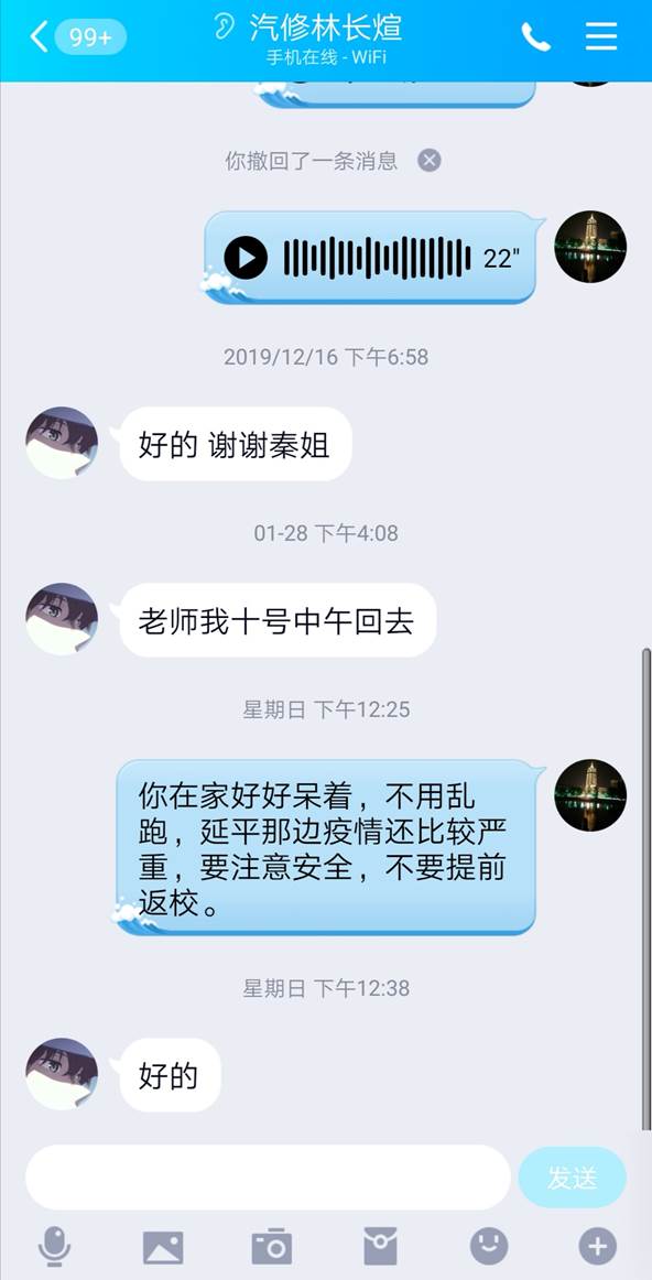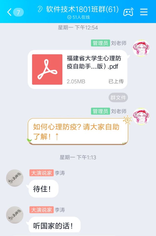 林学系学生科长、辅导员丁灵妍:活用网络阵地,通过微信、QQ与学生保持密切联系,谋划设计网上学生活动,通过微信、微博、直播平台和QQ群等及时传达正确的疫情防疫知识和学院相关精神,引导学生增强自我保护意识。同时关注困难学生,做好答疑解惑。