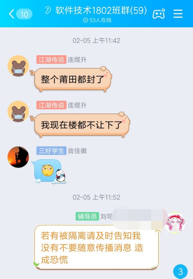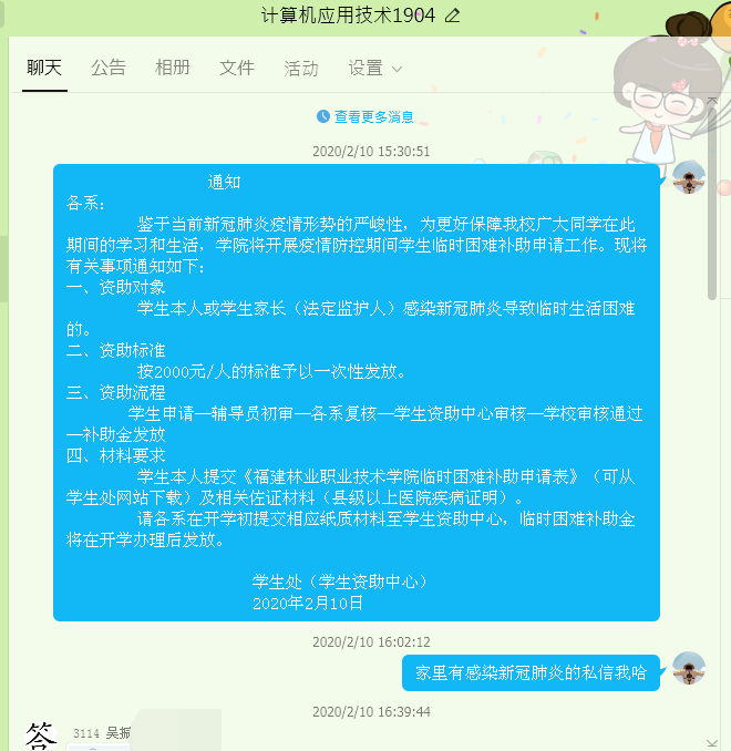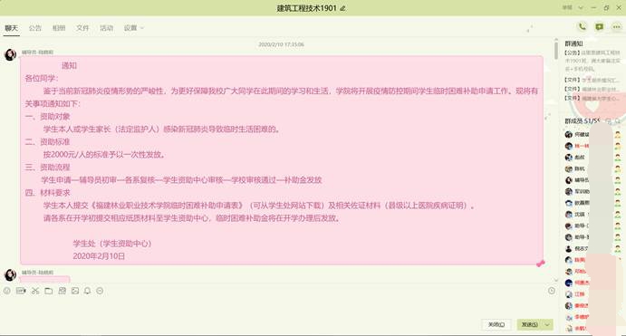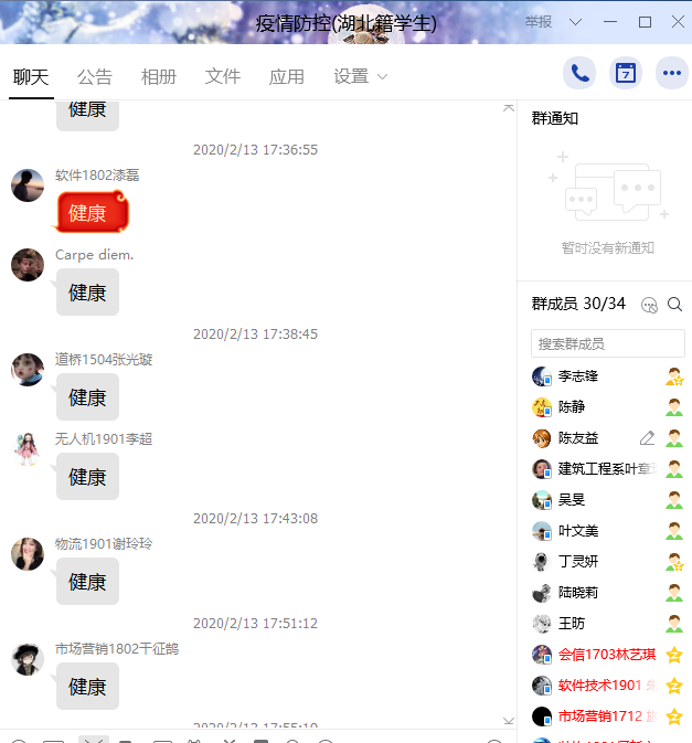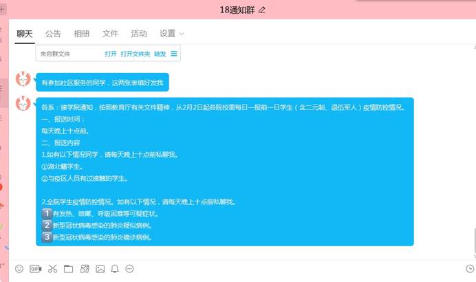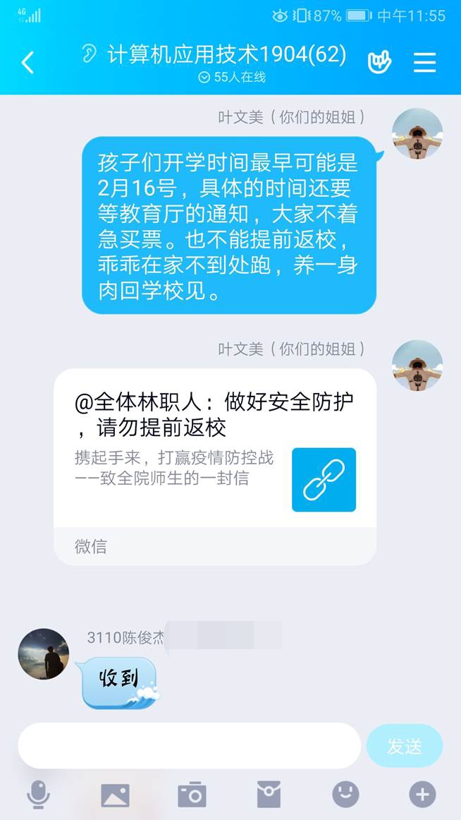 何时返校、疫情病例、注意事项……学工队伍将疫情防控的重要性和紧迫性传达到位,让学生坚定信心,为控制疫情做力所能及的贡献。建筑系室内设计1801班王赐敏同学认为:“学院推迟开学和避免提前返校,正是为了广大师生的生命健康考虑,每天老师同学们彼此的温暖鼓励,我变得安心,对早日战胜疫情也充满了信心。”