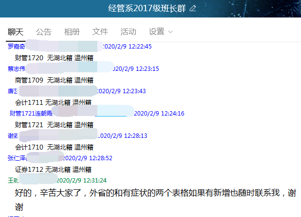 为准确掌握全院9955名学生身体健康状况,我院学工队伍强化监测,责任到人,筑牢信息防线。1月28日,明确要求辅导员立即提前结束寒假休假状态,通过网络就地开展工作,全面排查重点地区学生信息,建立重点监测人员信息库。1月30日,积极利用大数据筛查信息,辅导员、班主任逐一联系,确认学生身体状况。2月1日,院、系、班建立防疫信息员,填报《湖北(武汉)籍学生信息表》、《途经湖北或与疫区人员接触学生信息表》、《温州籍学生信息表》、《可疑症状学生信息表》、《省外学生学生信息表》、《留校学生信息表》,实行“日报告”制度。2月2日起,实行每日“零报告”制度,持续绷紧防控疫情之弦。