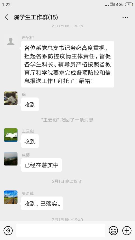 学院党委副书记严绍裕:疫情面前无小事,作为一名学工干部,一名党员,我们要响应党的号召,服从学院的安排,本着高度负责的态度做好每一件事,为阻击疫情,为履行肩负的职责和担当,我们心中有爱,我们无惧无畏。雾霾总有散的时候,疫情总有战胜的时候,众志成城,没有我们过不去的坎儿。