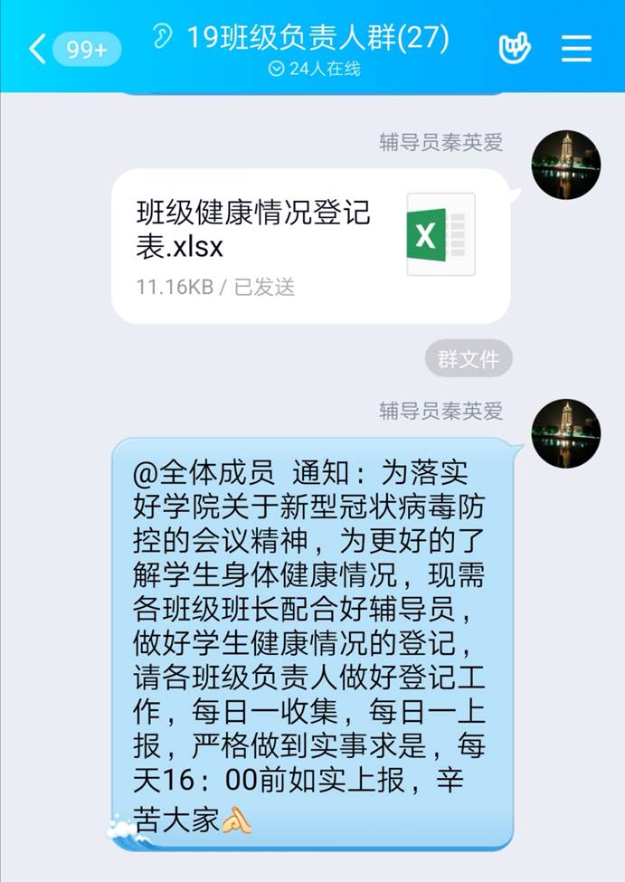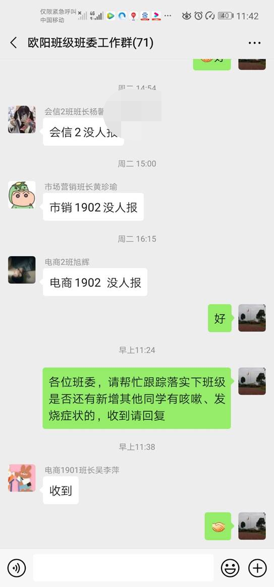 经管系学生科长、辅导员王昉:班委群设置每天闹钟,每个班委负责5-10个学生定点催;每天早上班级防疫信息员对填报数据进行筛查,对没完成的数据、填报格式有误的数据、有疫情的数据等进行第一关口核实、催促;辅导员再第二次核查、督促钉子户和困难户。