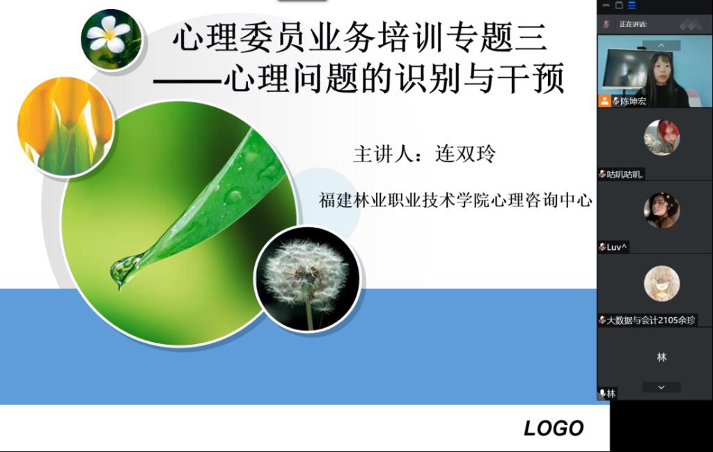 2022年3月15日下午,学生工作部心理老师连双玲为2021级心理委员开展线上专题培训讲座——心理问题的识别与干预。