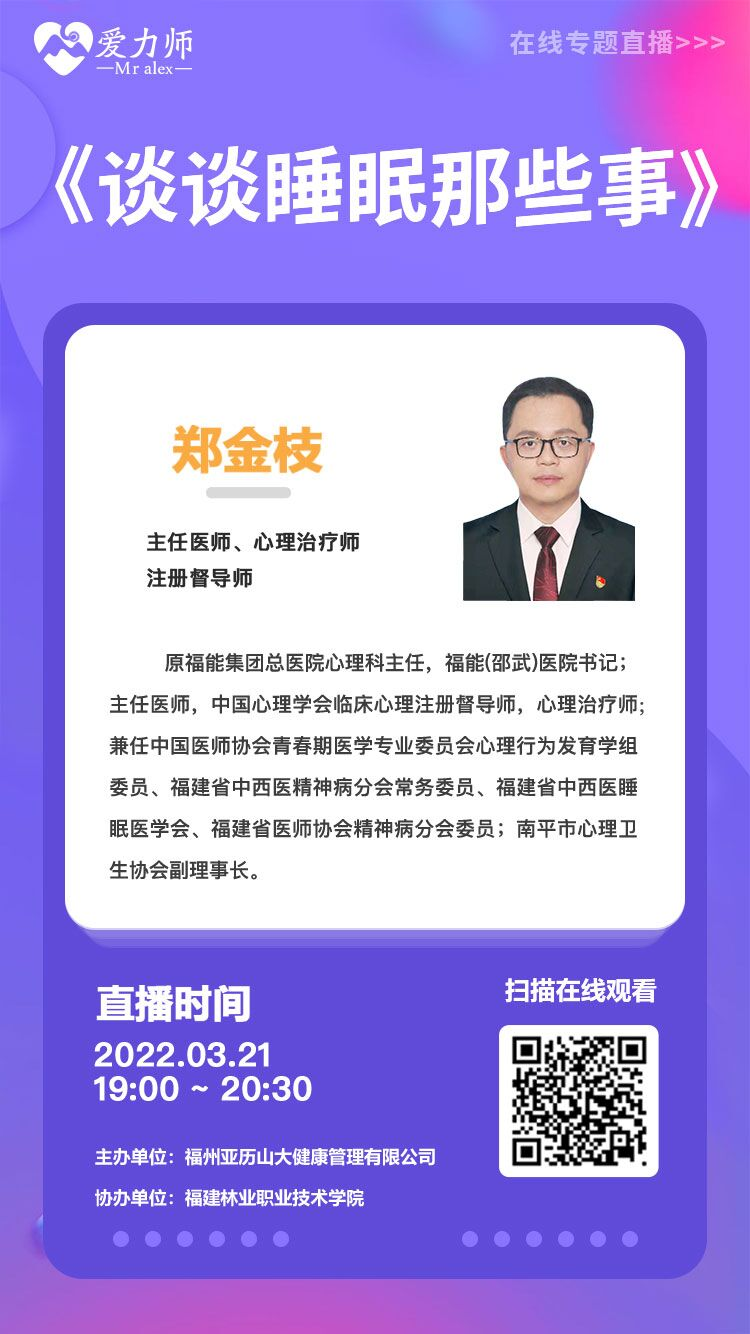 今年的3月21日是全球第二十二个“世界睡眠日”,结合今年“良好睡眠 健康同行”的主题,学生工作部联合爱力师特邀原福能集团总医院心理科主任、中国心理学会临床心理注册督导师郑金枝主任举办线上主题讲座——《谈谈睡眠那些事》。