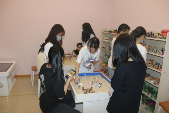 在沙盘体验活动中,工作人员带领着同学们触摸沙子、观看模型,讨论交流、摆放出了自己内心的沙盘世界。