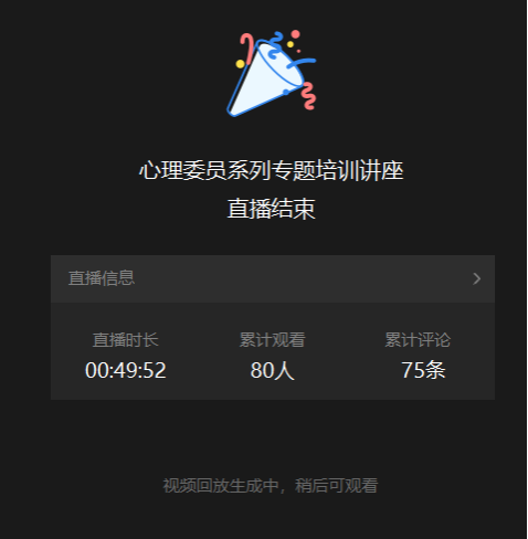 此次心理委员专题培训讲座体现了我校对大学生心理健康的高度重视,增强了心理委员识别自杀危机的能力,进一步提高心理委员专业能力,为我校心理健康工作的进一步开展打下良好基础。