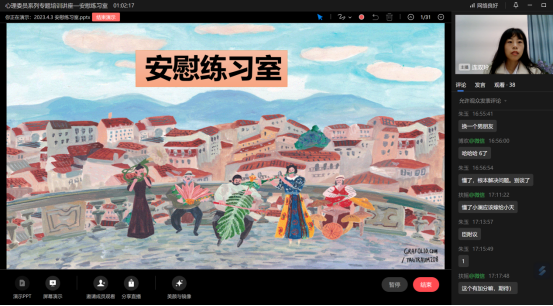 2023年4月11日下午,学生工作部心理老师连双玲为2021级心理委员开展线上专题培训讲座——安慰练习室。