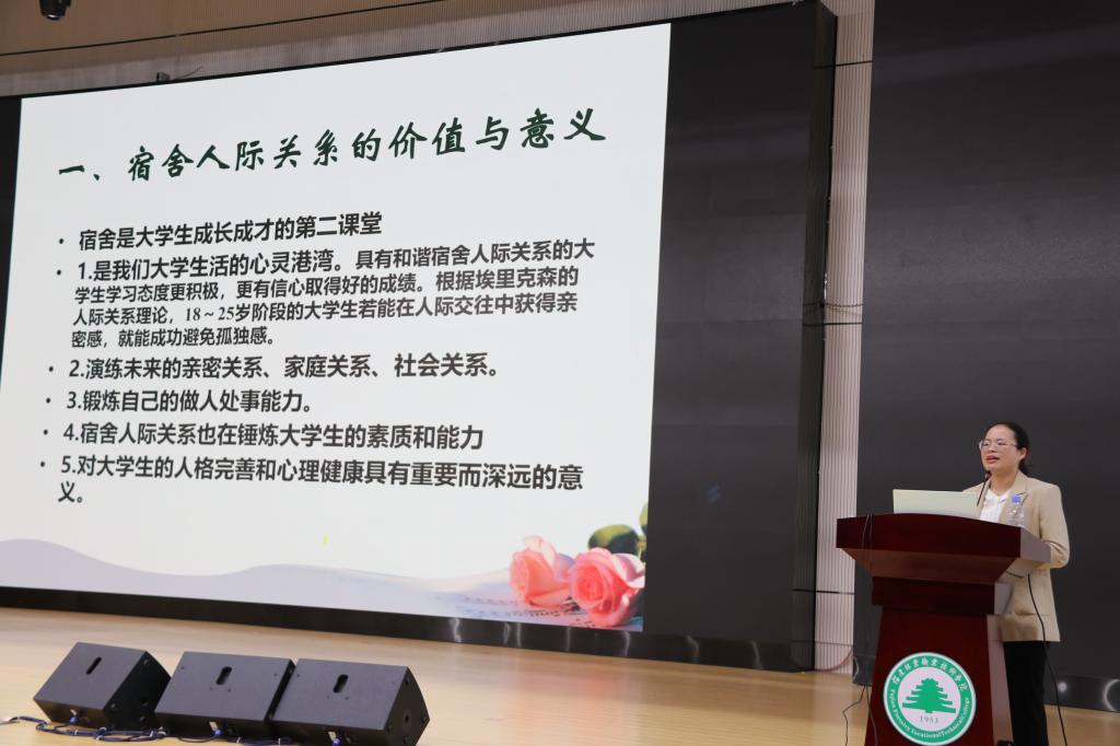 为帮助在校大学生构建健康积极的人际关系,培养正确的心理健康理念,学会更好地处理宿舍人际交往,营造温馨和谐的宿舍氛围。2023年4月25日下午,学生工作部在江南校区体育馆举办大学生宿舍人际关系专题讲座——有缘相聚一室,共营温暖生活,特邀福建幼儿师范高等专科学校心理健康教育中心主任罗香群副教授主讲,学生工作部副部长陈红英主持,各系学生科长、辅导员、心理健康老师及全院800余名学生到场聆听。