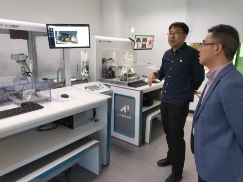 在杨欧副院长的陪同下,华建祥书记一行先后参观了工业视觉微缩实训中心、智能机器人实训室、云计算应用实训室、大数据技术实训室、虚拟仿真实训室等,杨欧副院长详细介绍了各实训室的功能和用途,为系部实训室和产业学院的建设提供了参考。
