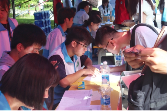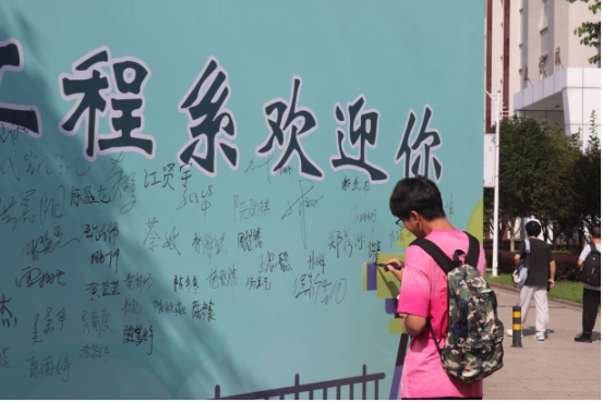 在系大本营,班级班导收集报到材料、为新生发放带有我系Logo的钥匙扣,在报到完成后,由“蓝马甲”志愿者带领新同学在系迎新签名墙上签字并合影留念,最后由志愿者们接引“一站式”入住宿舍,安放行李。高效、便捷、贴心的报到,让刚刚离乡的新生们感受到“家”的温暖。