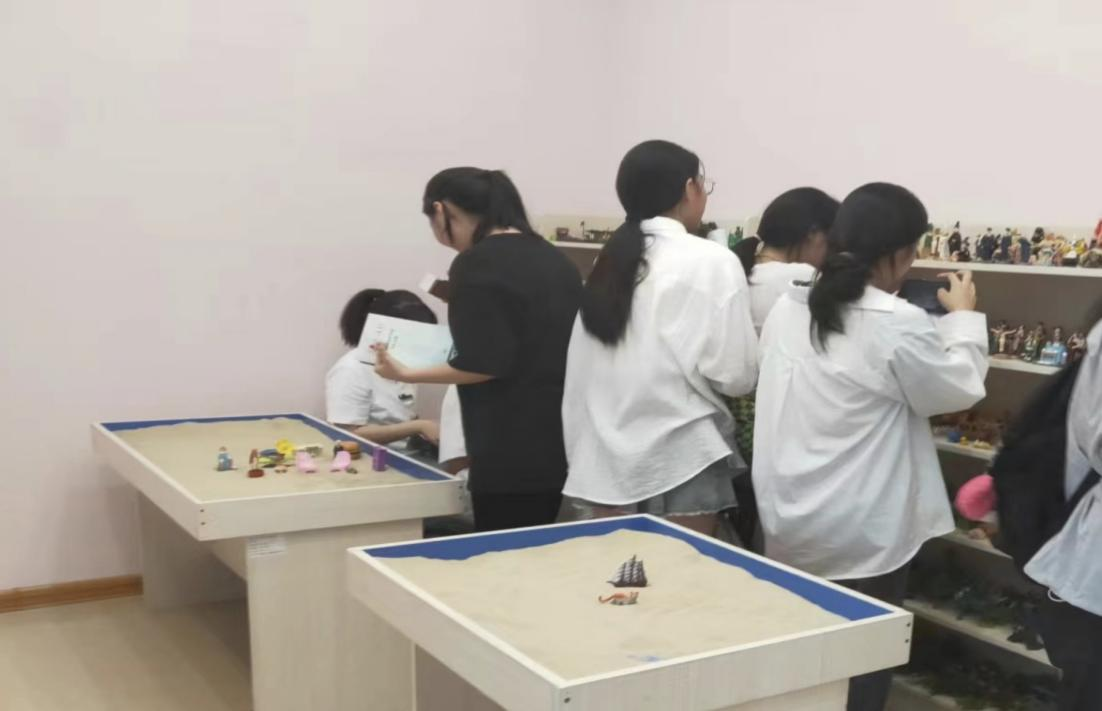 一沙一世界,沙盘为同学们展现出奇妙的心灵花园,在沙盘游戏室参观体验环节中,同学们纷纷动手,用沙具模型来勾画出自己丰富多彩的内心世界,这一活动让同学们更加了解自己。